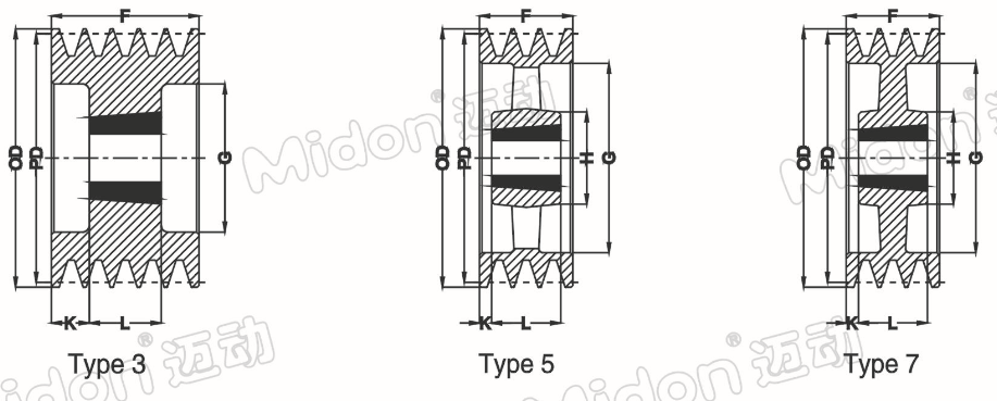 | PartNo:/PDGV 型號(hào)/節(jié)徑-槽數(shù) | O D 外徑 | Bush 錐套 | MaxBore最大孔 | Type 圖列 | F 輪寬 | G 緣徑 | K - | L 轂厚 | H 轂徑 | Wt.Less Bush 重量 |